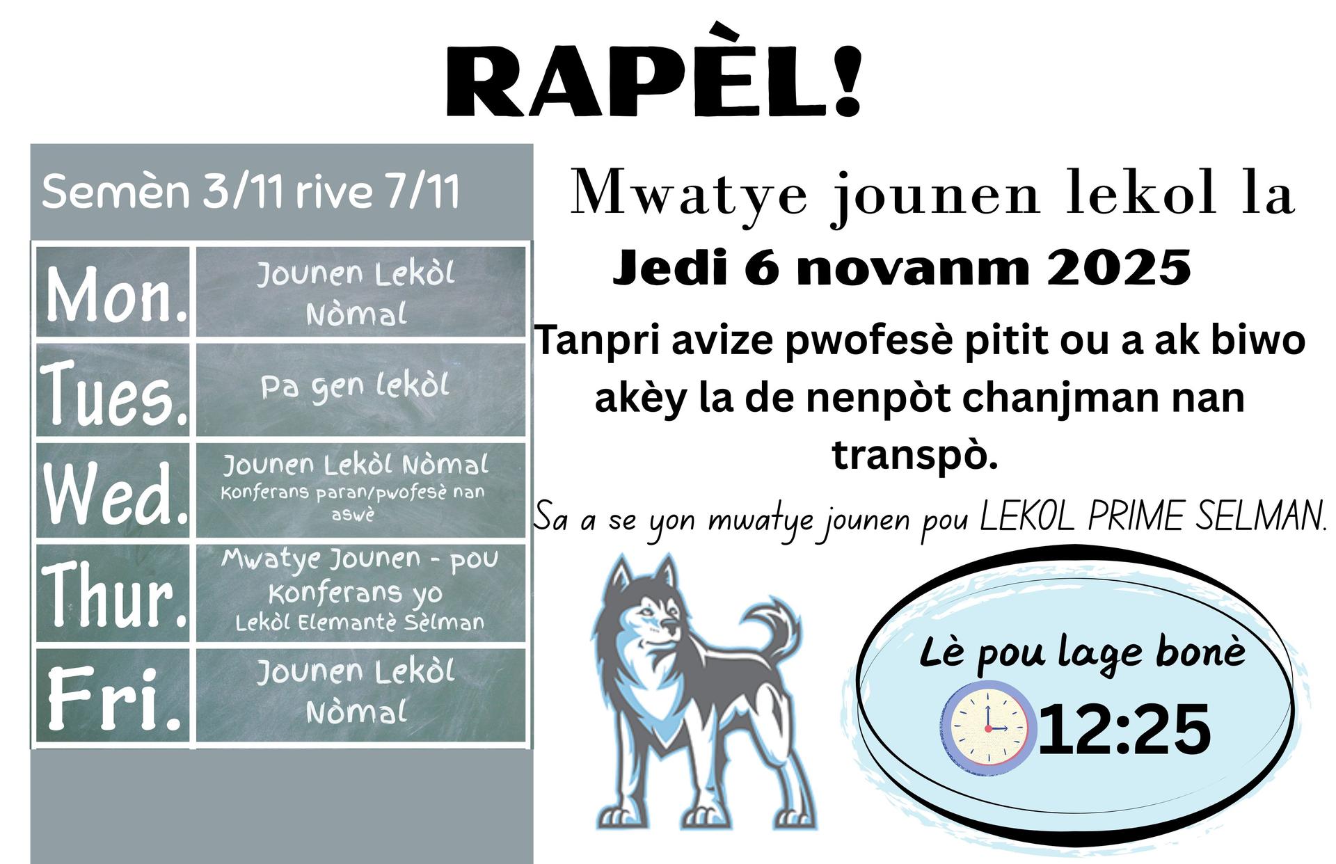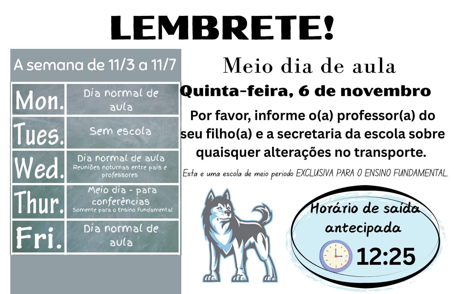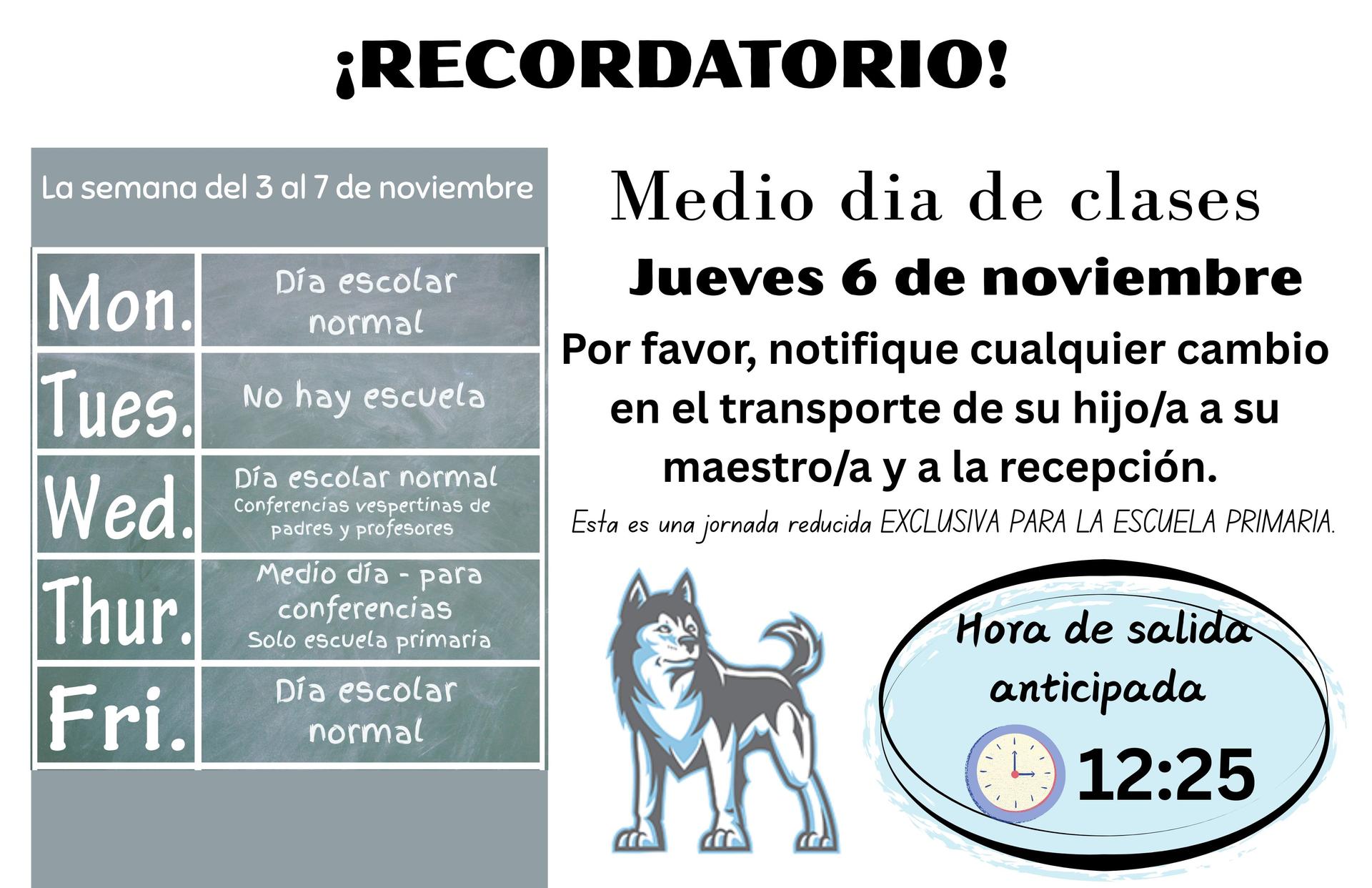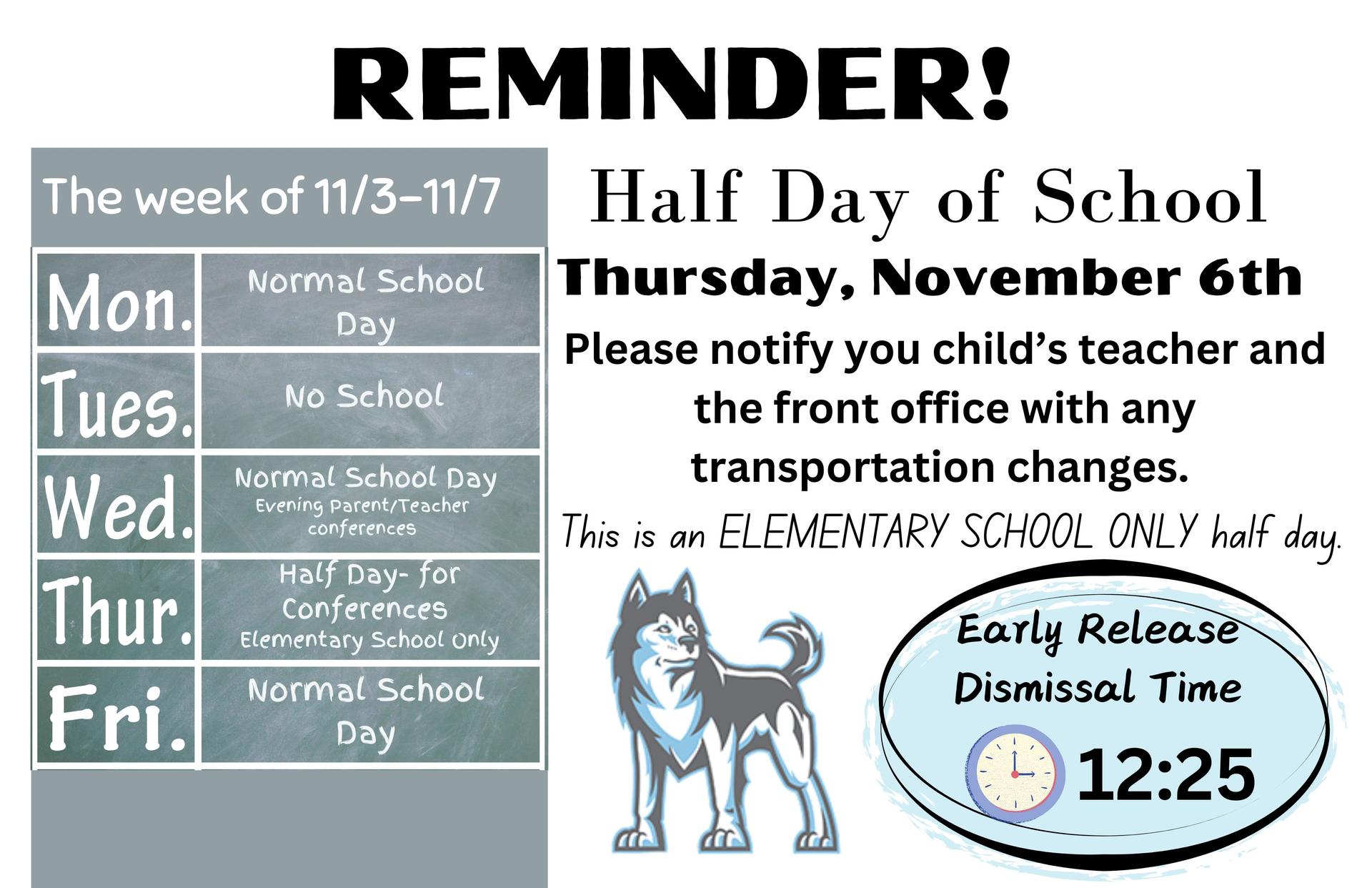 Reminders for Week of 11/3-11/7 - No School Tuesday (11/4) and Half Day on Thursday (11/6) |