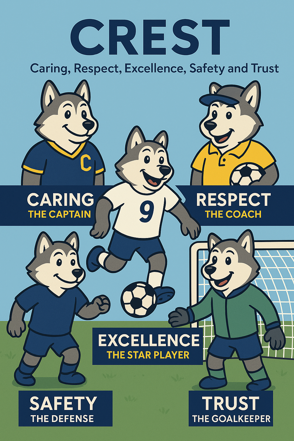 We were so excited to end our school-spirit filled school day with our first CREST assembly! Our newest Golden Huskies will be published in our next Howler, but all were selected for showing CREST 100% of the time. While this Assembly's theme was CREST All Stars. The following assemblies will focus on each aspect of CREST, that is, Caring, Respect, Excellence, Safety, and Trust. Below is the analogy we used and will continue to use to frame our celebration of CREST, as a team effort, during our remaining CREST assemblies. |