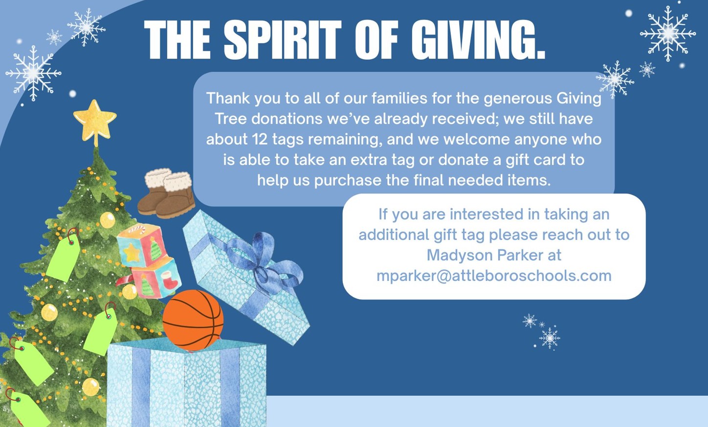 We still have 12 tags remaining on our Giving Tree—if you’re able to help, we appreciate your support. See below for more information.