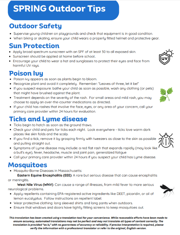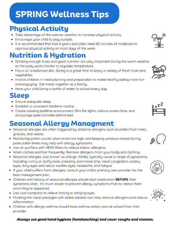 As we are now officially in Spring, days are longer and plants will be blooming, putting allergens in the air. Please check out the Spring Wellness tips, scroll though to find your preferred language
