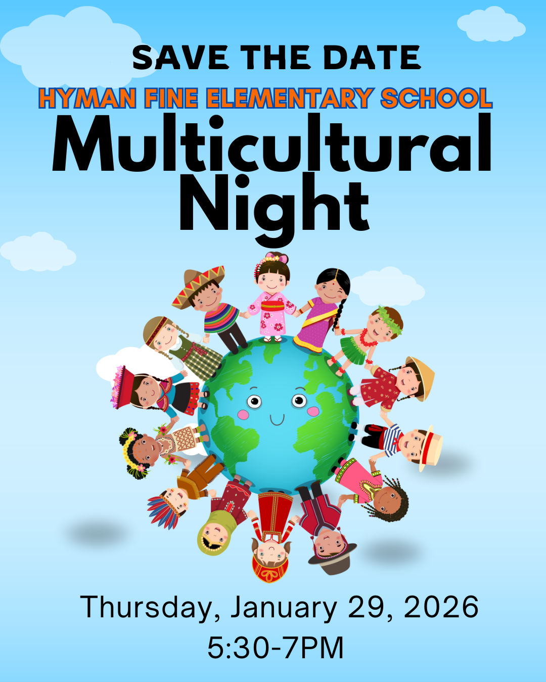 Please join us Thursday, January 29th, 2026, from 5:30-7pm for Multicultural Night Here at Hyman Fine Elementary School! |