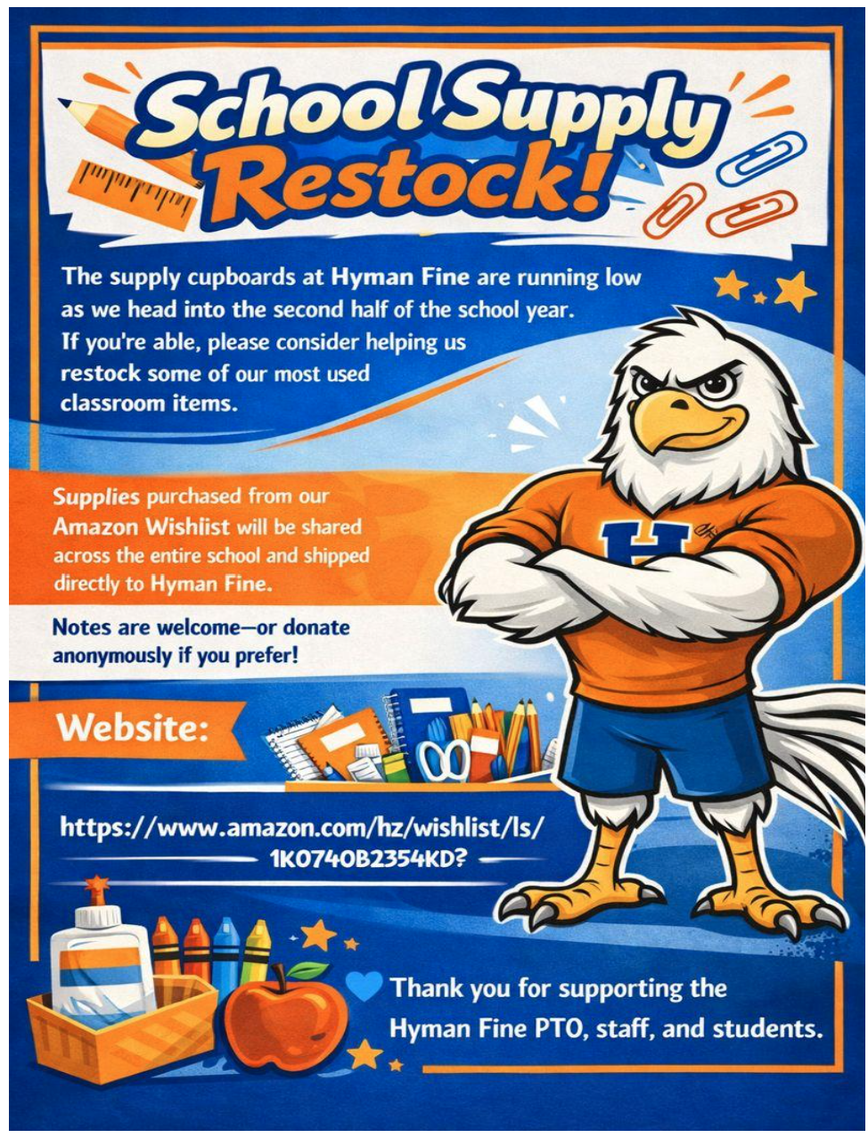 🏫📦School Supply Restock – We Need Your Help! As we approach the mid-year mark, the cupboards at Hyman Fine are starting to get bare. We’d love to do a school-wide restock of our most used and most requested items to support all of our classrooms. Please consider using the Amazon link below to purchase supplies that will be shared across the entire school and among classes. You’re welcome to include a small note with your donation—or send it anonymously if you prefer. All items will be shipped directly to Hyman Fine for easy delivery. Thank you, as always, for your continued support of the Hyman Fine PTO, staff, and students. 💙📚