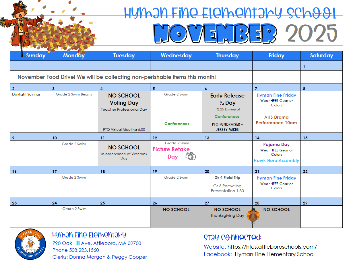 Additionally, Picture Retake Day will take place on Wednesday, November 12. If your child was absent on the original picture day or would like a retake, please be sure to send them prepared that morning.