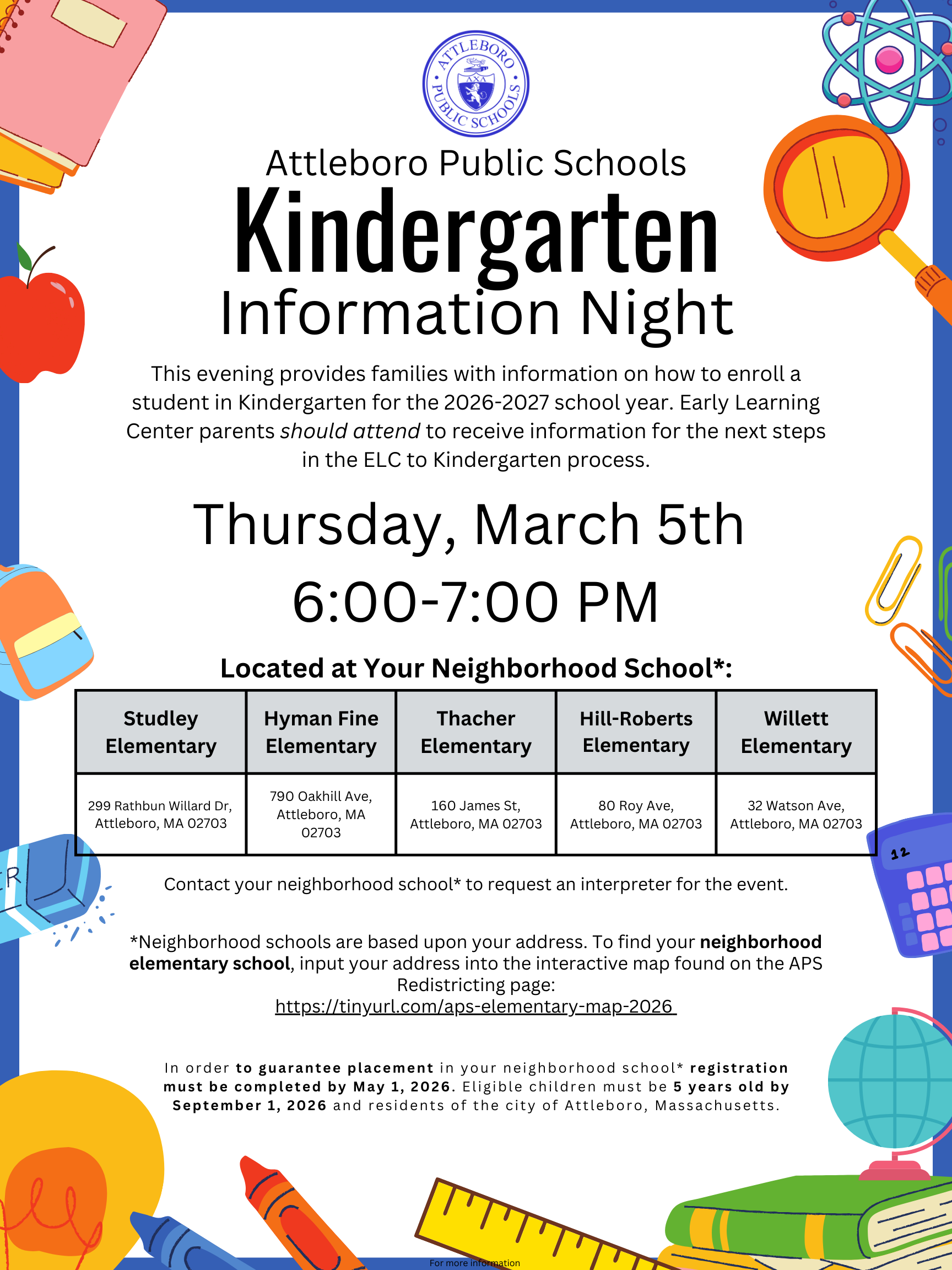 Do you know anyone with school age children ready for Kindergarten for next year? The Attleboro Public Schools is pleased to host Kindergarten Information Night on March 5, 2026, at 6PM. This evening provides families with information on how to enroll a student in Kindergarten for the 2026-2027 school year. Early Learning Center parents should attend to receive information for the next steps in the ELC to Kindergarten process. View this interactive map to find your neighborhood school for the 2026-2027 school year.