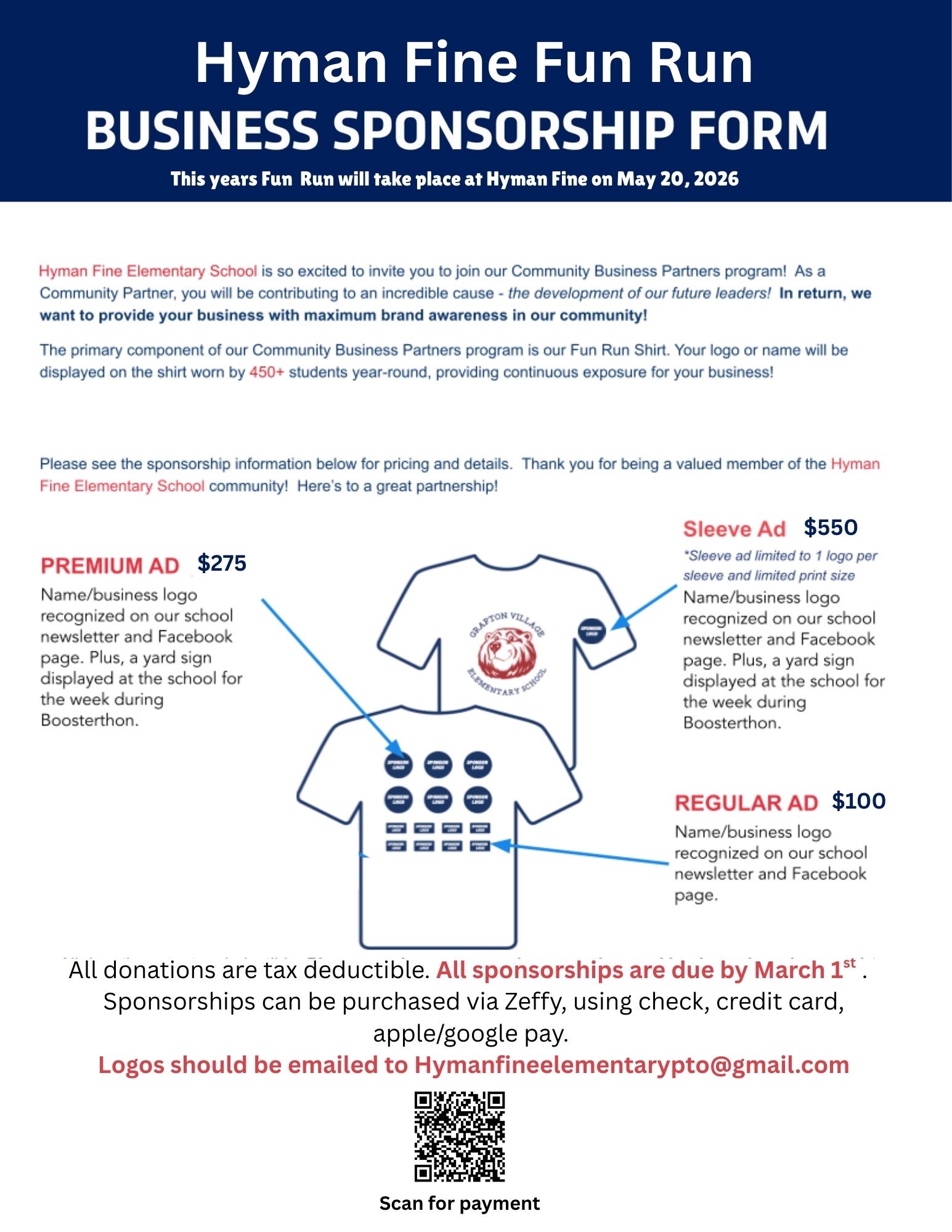 Get excited for the 9th Annual Hyman Fine Fun Run! We are starting the process by looking for business sponsors to help fund our t-shirts. Please see below for more details. We thank you in advance for all of your support. |