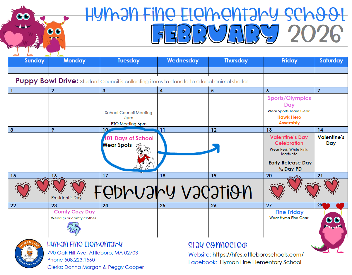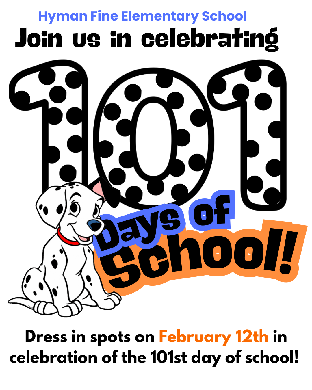 Due to last week’s snow cancellations, our 101st Day of School celebration has been rescheduled and will now take place on Thursday, February 12th (not February 10th as originally noted on the February calendar). To mark this special milestone, students are invited to dress in spots, inspired by Disney’s 101 Dalmatians—we can’t wait to see their creative outfits!