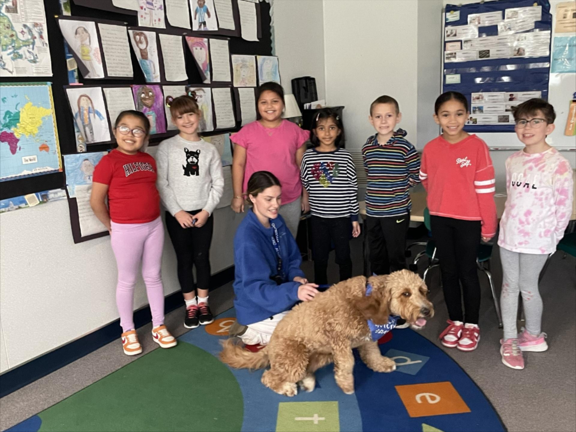Students and staff joined in the fun by wearing paw prints, Macy's brown and white colors, and Thacher colors, writing and drawing about what Macy means to them, and sharing lots of smiles (and a few belly rubs!). Macy soaked up all the love and attention — and, of course, a few extra treats.