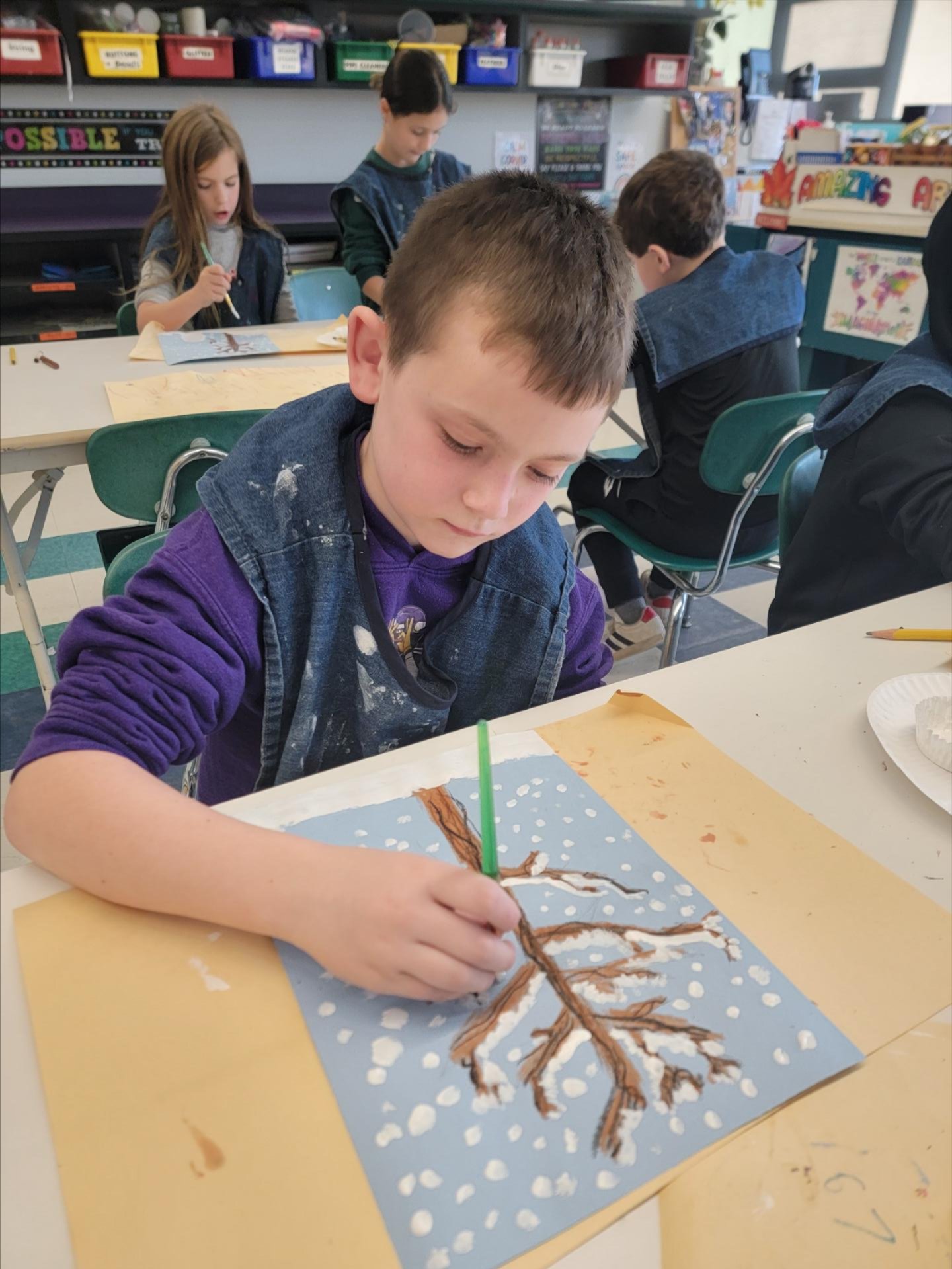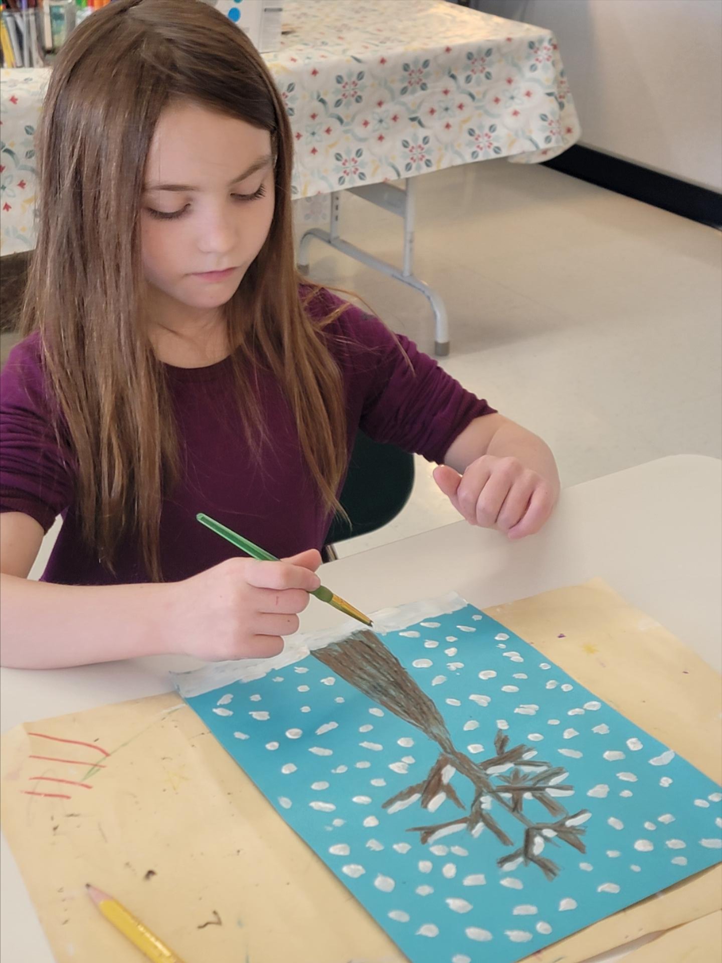 This month, our students have been exploring the theme of Winter. We are painting snowy landscapes with cardinals and birch trees, creating collages of winter houses and snowmen, and connecting math & art with symmetrical snowflake designs. Their work has captured the beauty of the season! These projects focus on using a variety of materials and techniques, such as watercolor resist and paper layers, to bring their visions to life.
