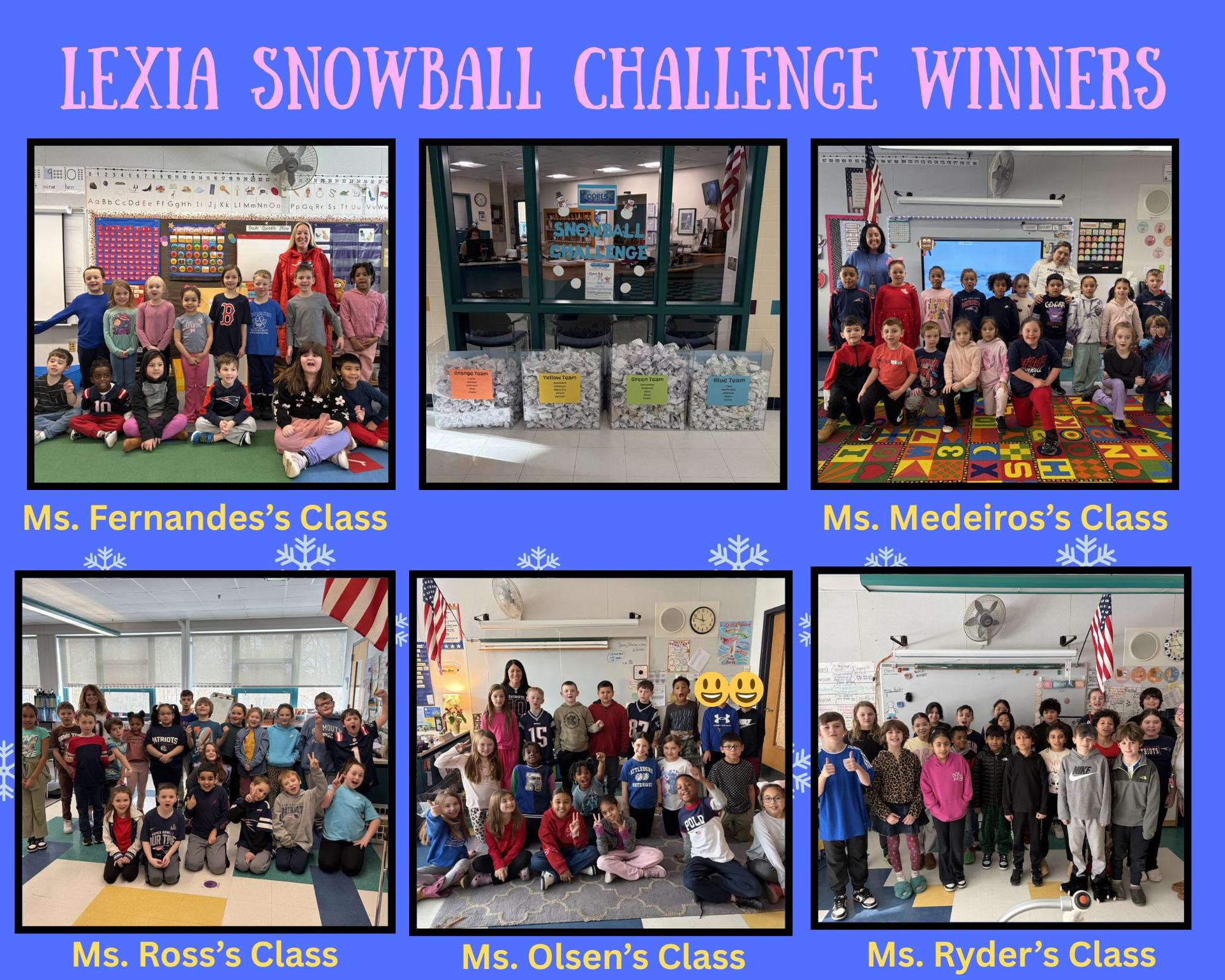 Congratulations to Ms. Fernandes, Ms. Medeiros, Ms. Ross, Ms. Olsen, and Ms. Ryder's class for being on the winning team for the Winter Lexia Snowball Challenge. This team worked together to earn 381 snowballs and walk away with the win! |