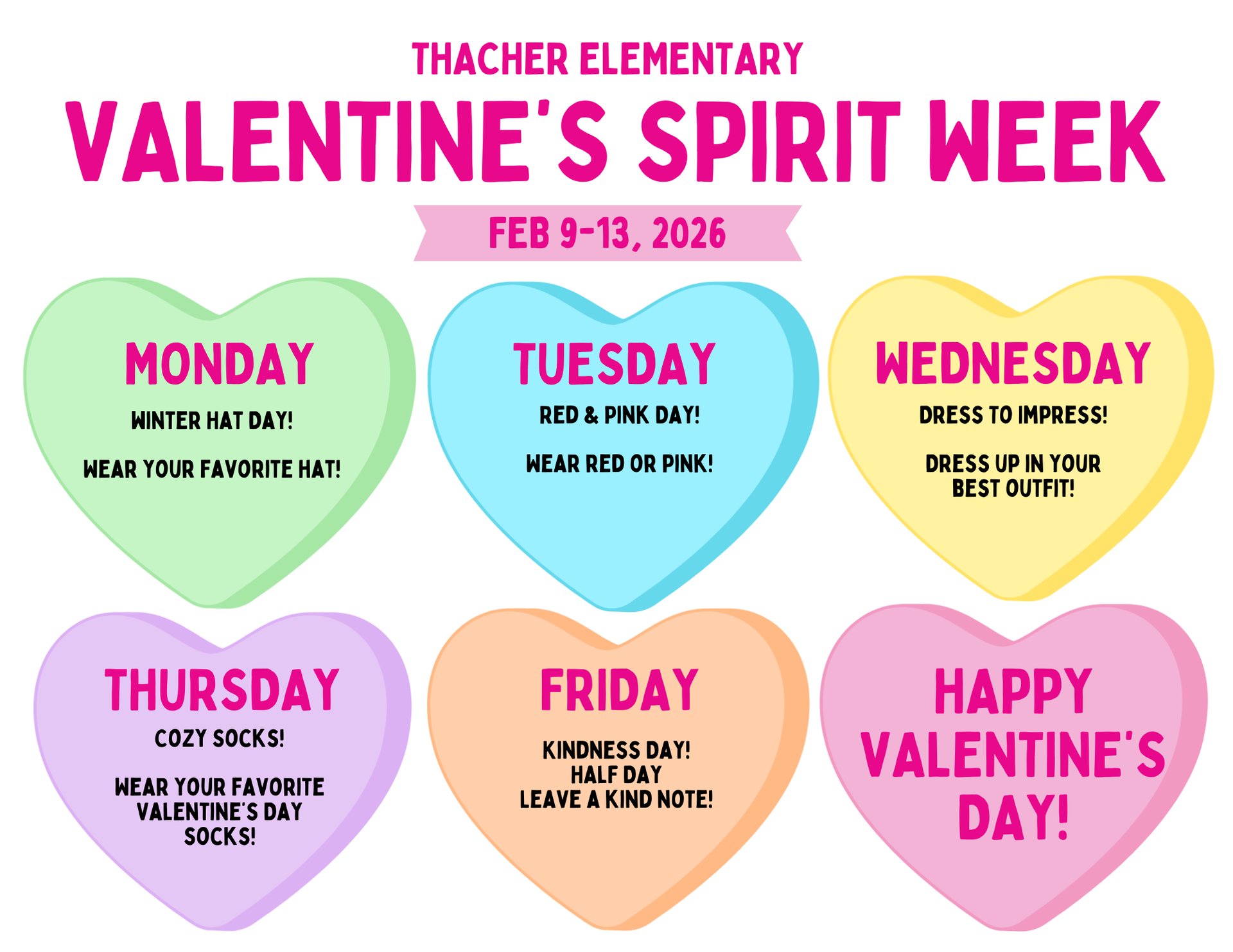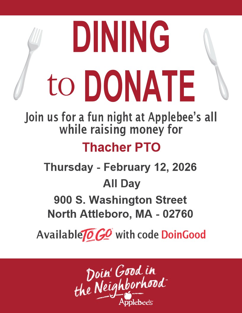 2025-2026 District Calendar of Events (click to view) February 9-13: Spirit Week! (see flyer above) February 9: Thacher School Spotlight Presentation at School Committee February 13: Early Release Day February 16 - 20: No School - Winter Vacation February 23: Return to school - Mobile Dentist will be here |