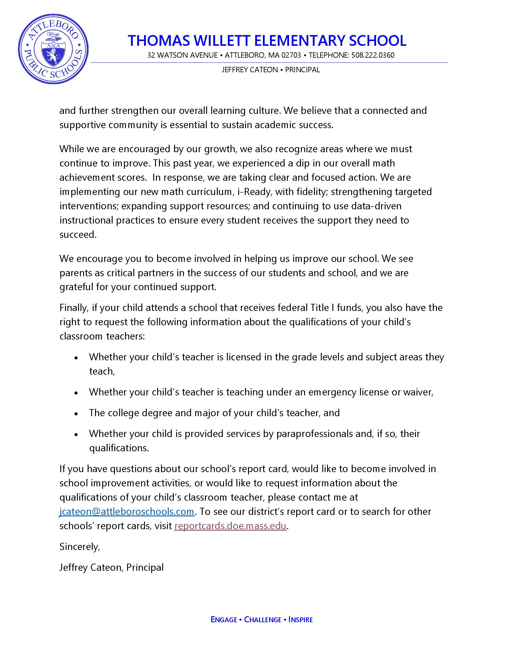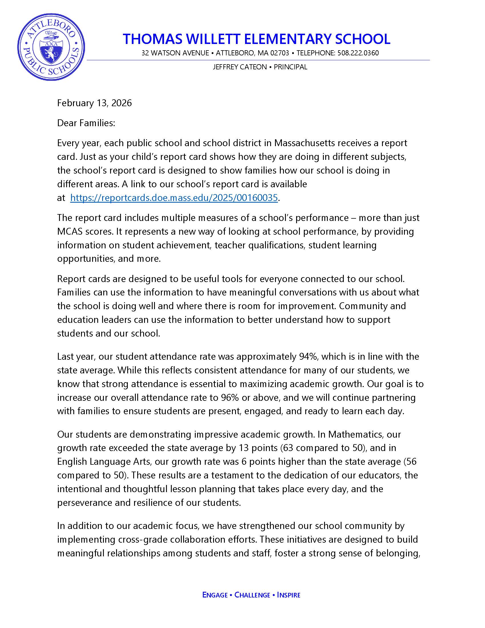 If you have questions about our schoolâs report card, would like to become involved in school improvement activities, or would like to request information about the qualifications of your childâs classroom teacher, please contact me at jcateon@attleboroschools.com. To see our districtâs report card or to search for other schoolsâ report cards, visit reportcards.doe.mass.edu.